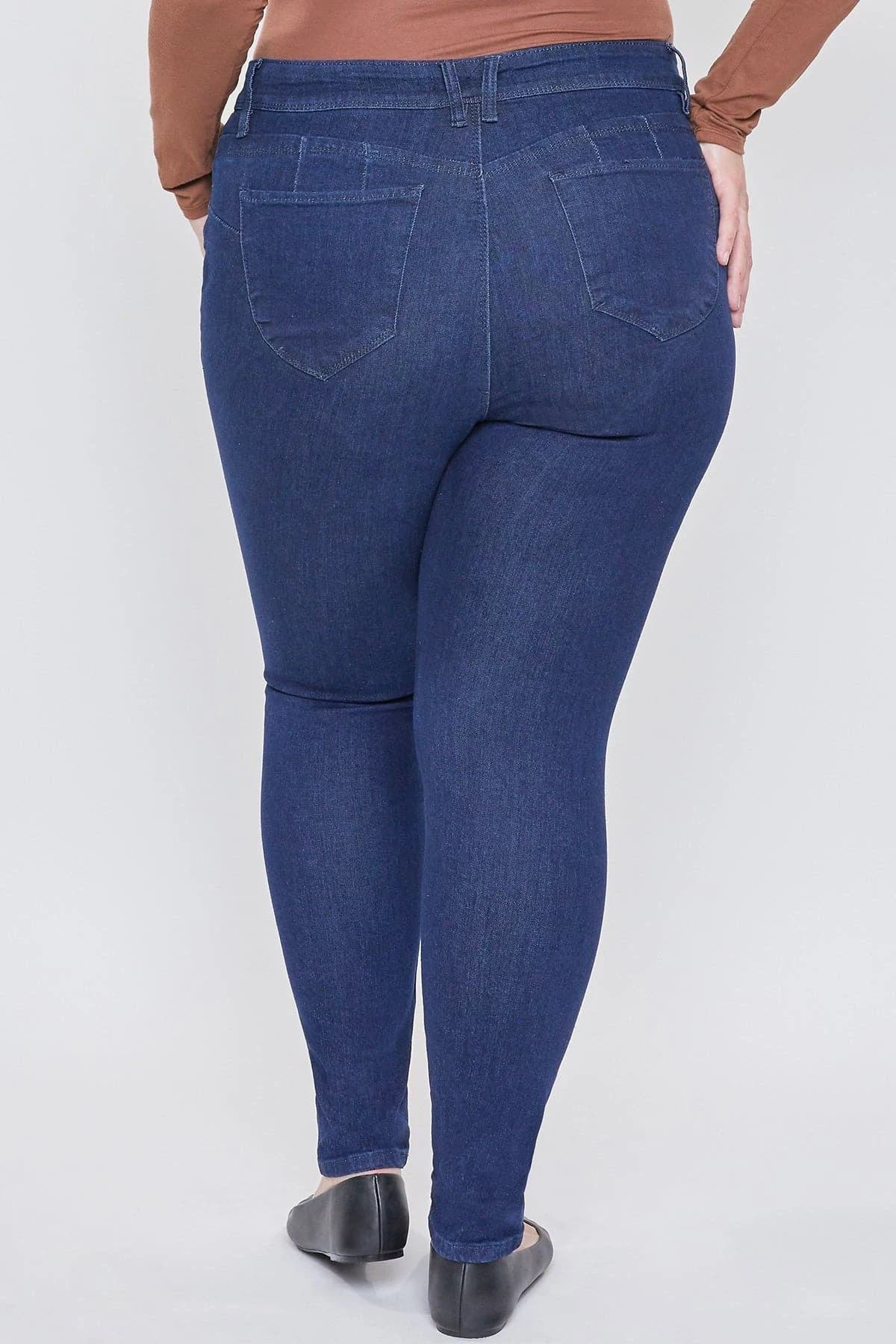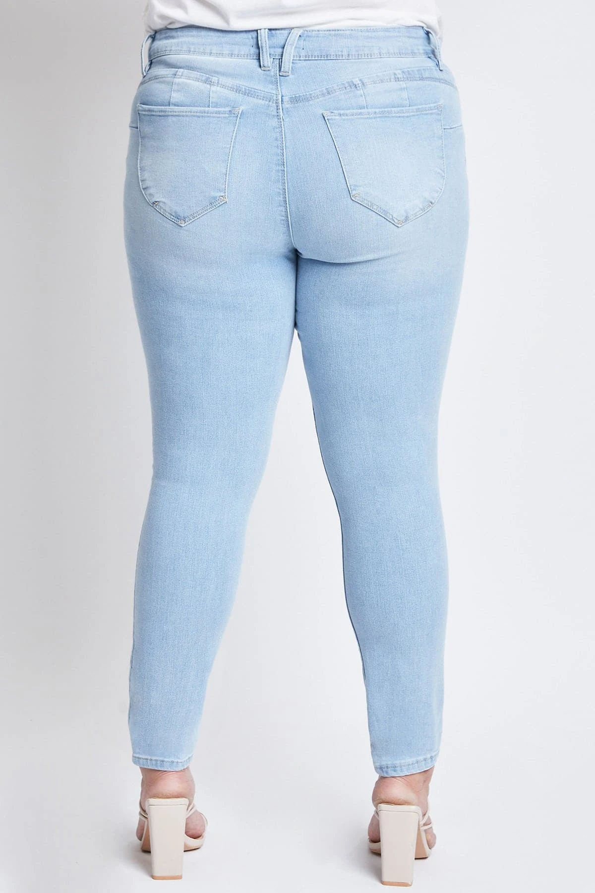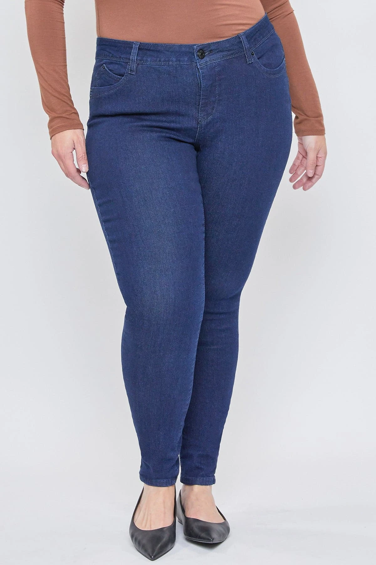 You can’t go wrong with our Women’s Plus WannaBettaButt Mid-Rise 1-Button Skinny Jean with Regular Hem. Designed with our signature WBB heart-shaped stitching and unique pocket shape to help enhance your curves and achieve a flattering, firmer look. We’ve also made these with super stretchy denim so they move with you throughout the day. You’ll love the way you look and feel in these jeans! Pair them with your favorite blouse and booties for a chic look.