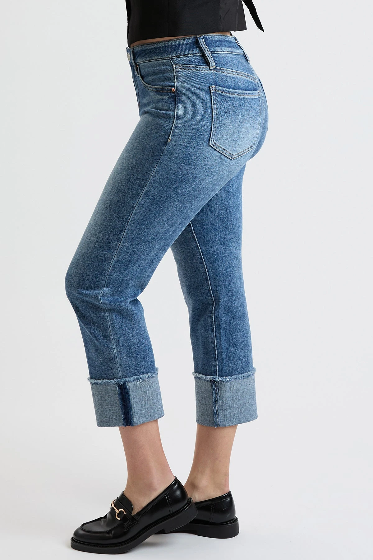 Make a bold statement with these Women’s Premium Stretch Mega Cuff Jeans. Designed to offer both comfort and a unique style twist, these jeans feature a mid-rise fit with the standout mega cuffs at the ankles add a trendy, fashion-forward touch. The oversized fray cuffs create a bold, eye-catching finish that takes your denim game to the next level, making these jeans perfect for showcasing your favorite footwear, from boots to sneakers.
