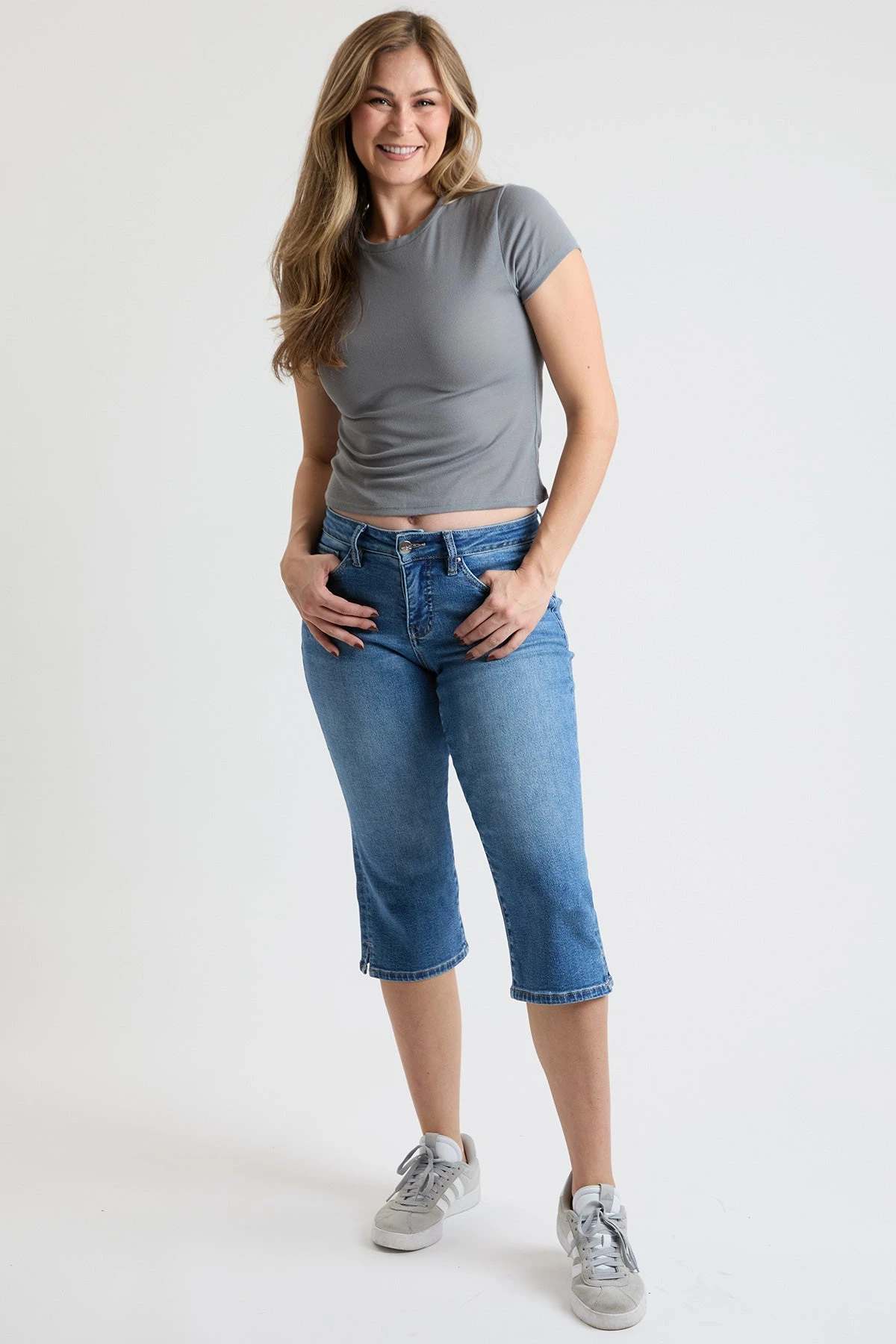 The summary and zipper fly ensure a secure, comfortable fit, while the versatile design makes them easy to pair with any top or shoes. These capris are an essential addition to your wardrobe for effortless, everyday wear.