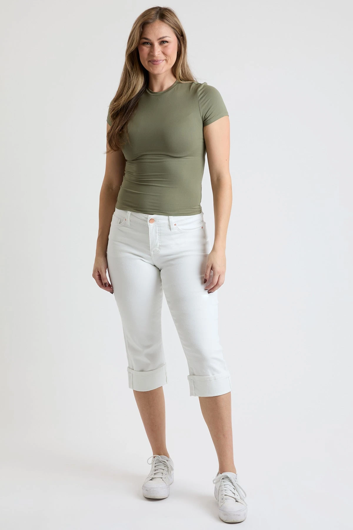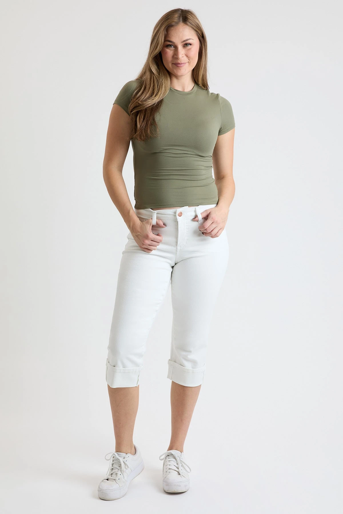 The Women’s Premium Stretch Essential Cuff Capri is the perfect blend of comfort and style for warm weather. Made from premium stretch fabric, these capris offer a flattering fit that moves with you throughout the day. The cuffed hem adds a polished, casual touch, making them versatile enough to dress up or down. Whether paired with a simple tee for a laid-back look or a blouse for a more put-together outfit, these capris are an essential addition to your closet.