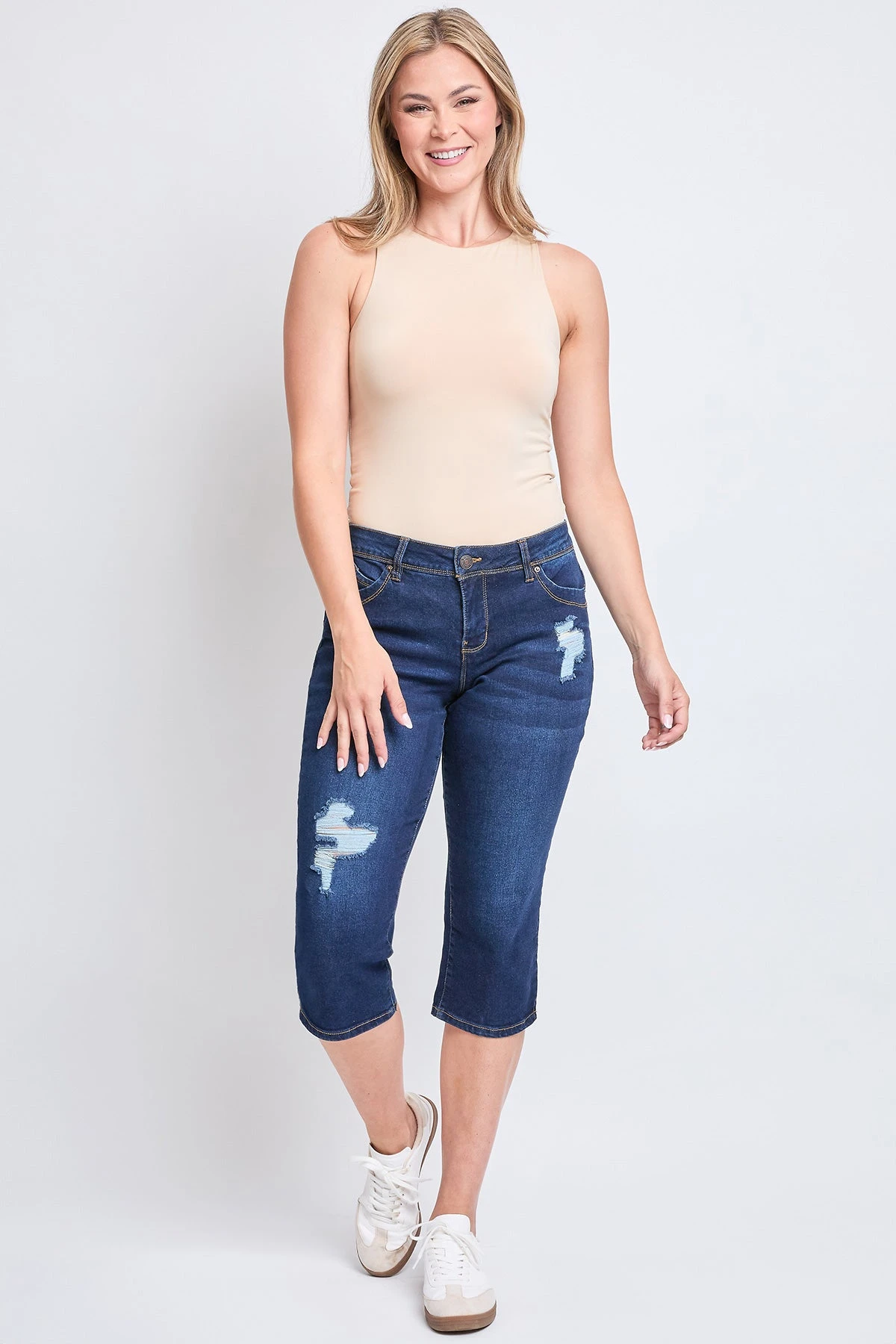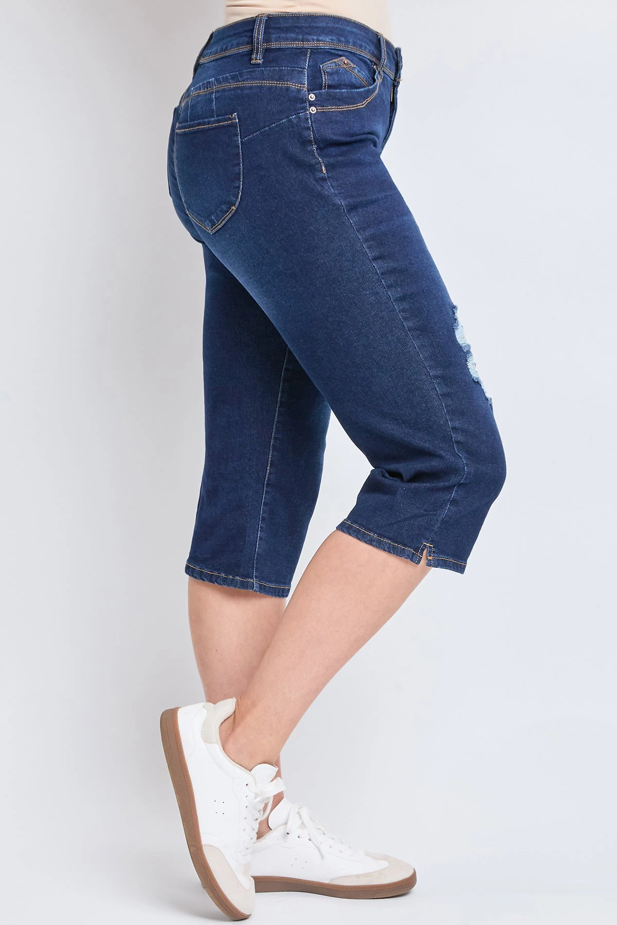 Update and upgrade your wardrobe with our Women’s Sustainable WannaBettaButt Capri Jeans Made with Recycled Fibers. These denim pants feature our signature WBB heart-shaped stitching and unique pocket shape to enhance your natural curves. Detailed with built-in panels and special construction for tummy control. Designed in a cropped length with a trendy side-slit hem. Style with a French tucked summary-up and sandals for a sophisticated look.