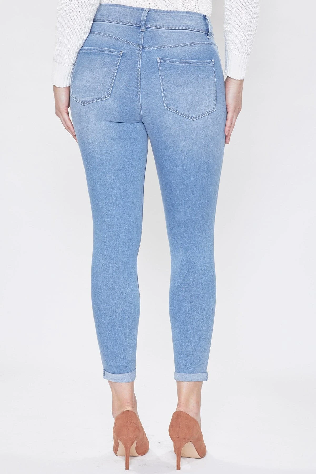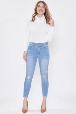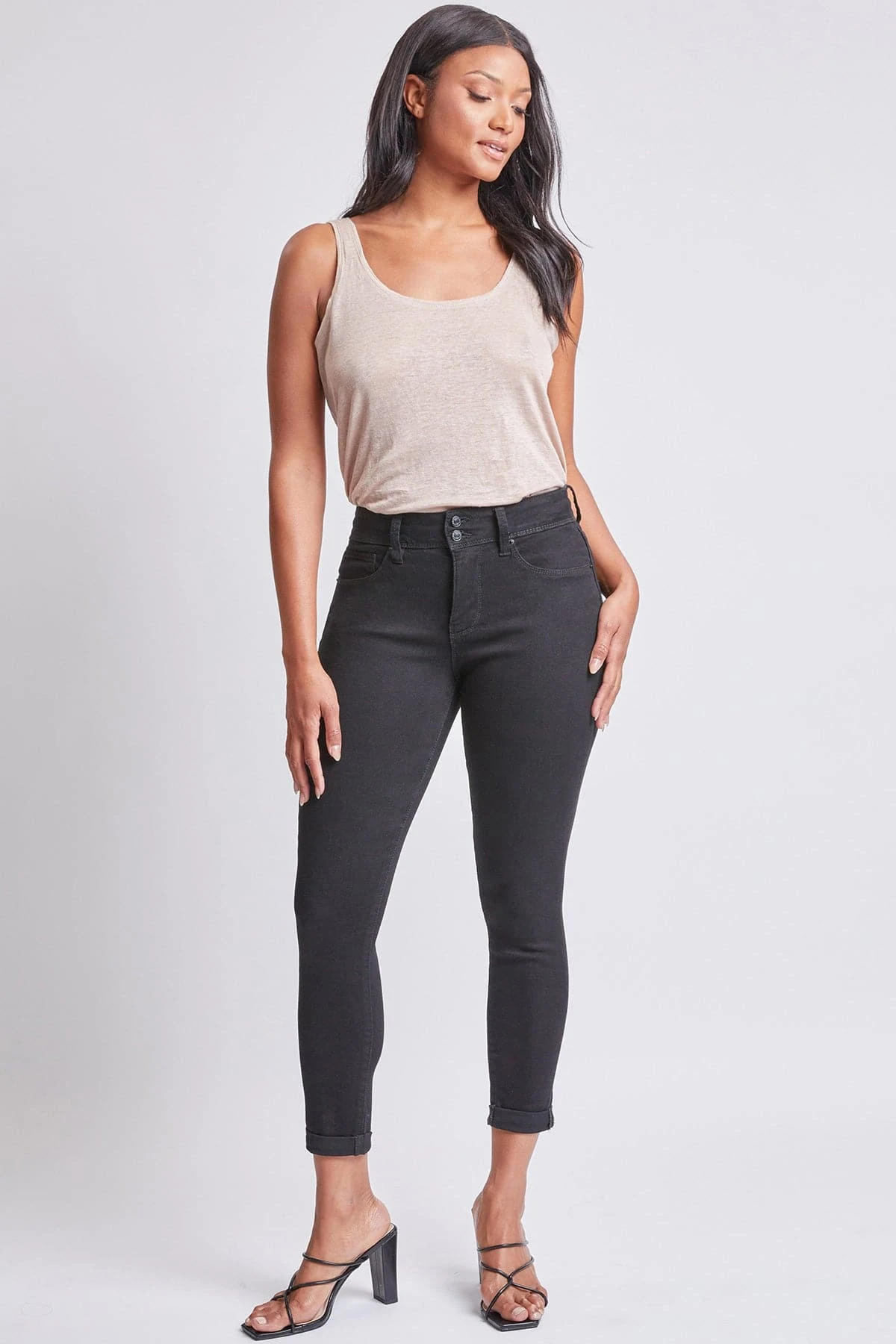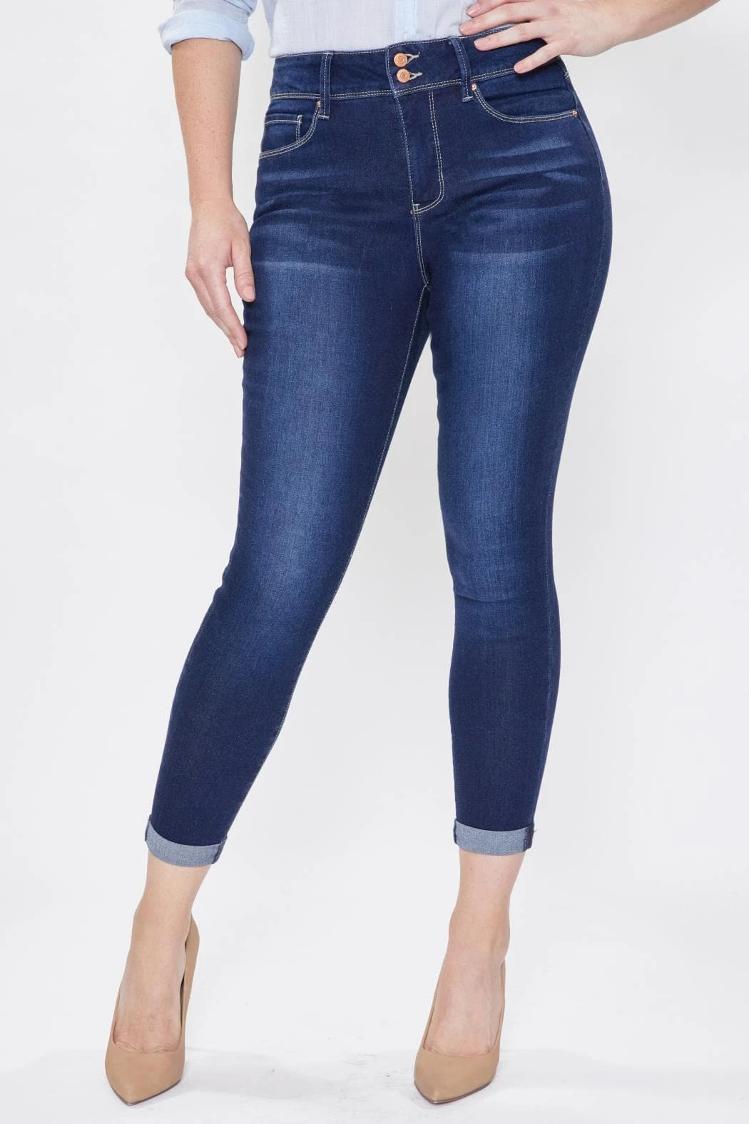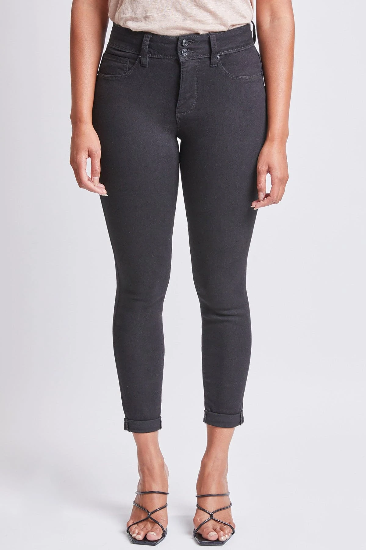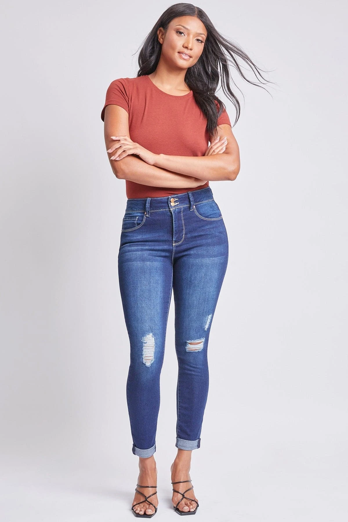 These Women’s Tummy Control 2 Button Rolled Cuff Jean are designed with slight fading, whiskering and light destruction for a comfortable and casual look. Featuring a classic five-pocket construction, rolled cuff hem, double-summary closure with front zip, and belt loops.