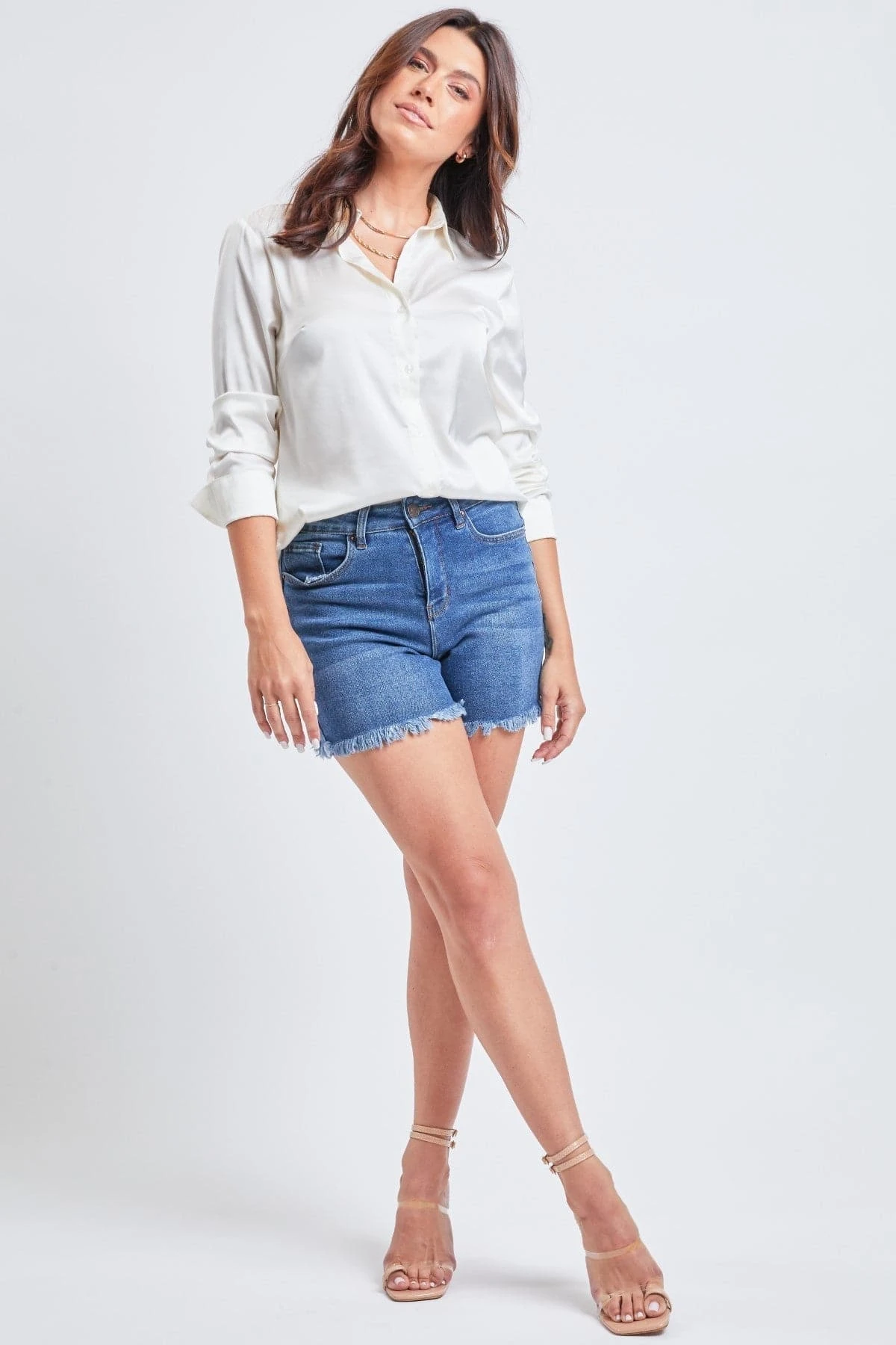 Everything you love about vintage denim, but with all the comfort! Our Women’s Vintage High-Rise Fray Hem Shorts feature light whiskering, frayed hems, and a subtle fading for that original vintage look. Made with advanced stretch so they have a lived-in feel. Designed in a high-rise that sits right below your belly summary. With the way these look and feel, you’ll be reaching for these shorts all Summer long! Wear casual with a cute tee and sandals, or dress up with a blouse and wedges!Â