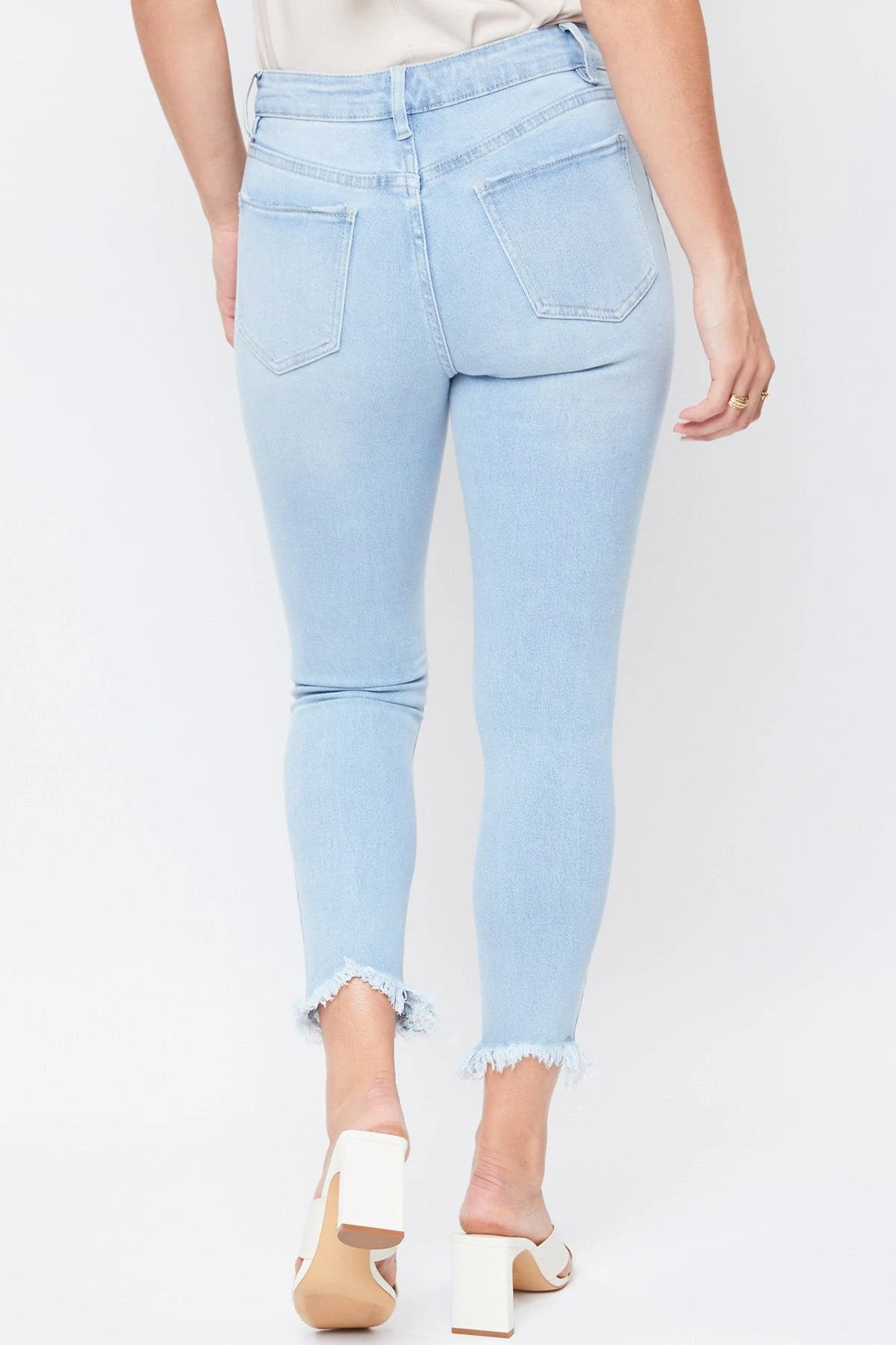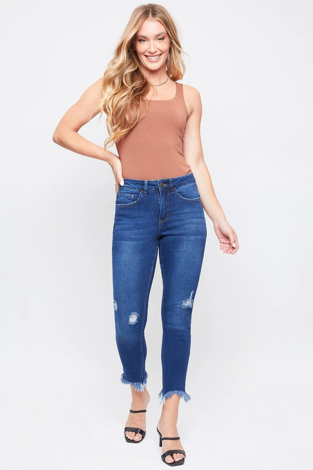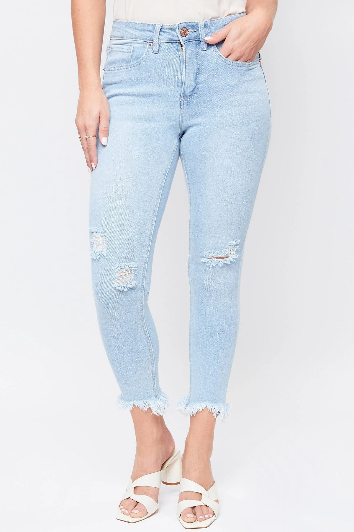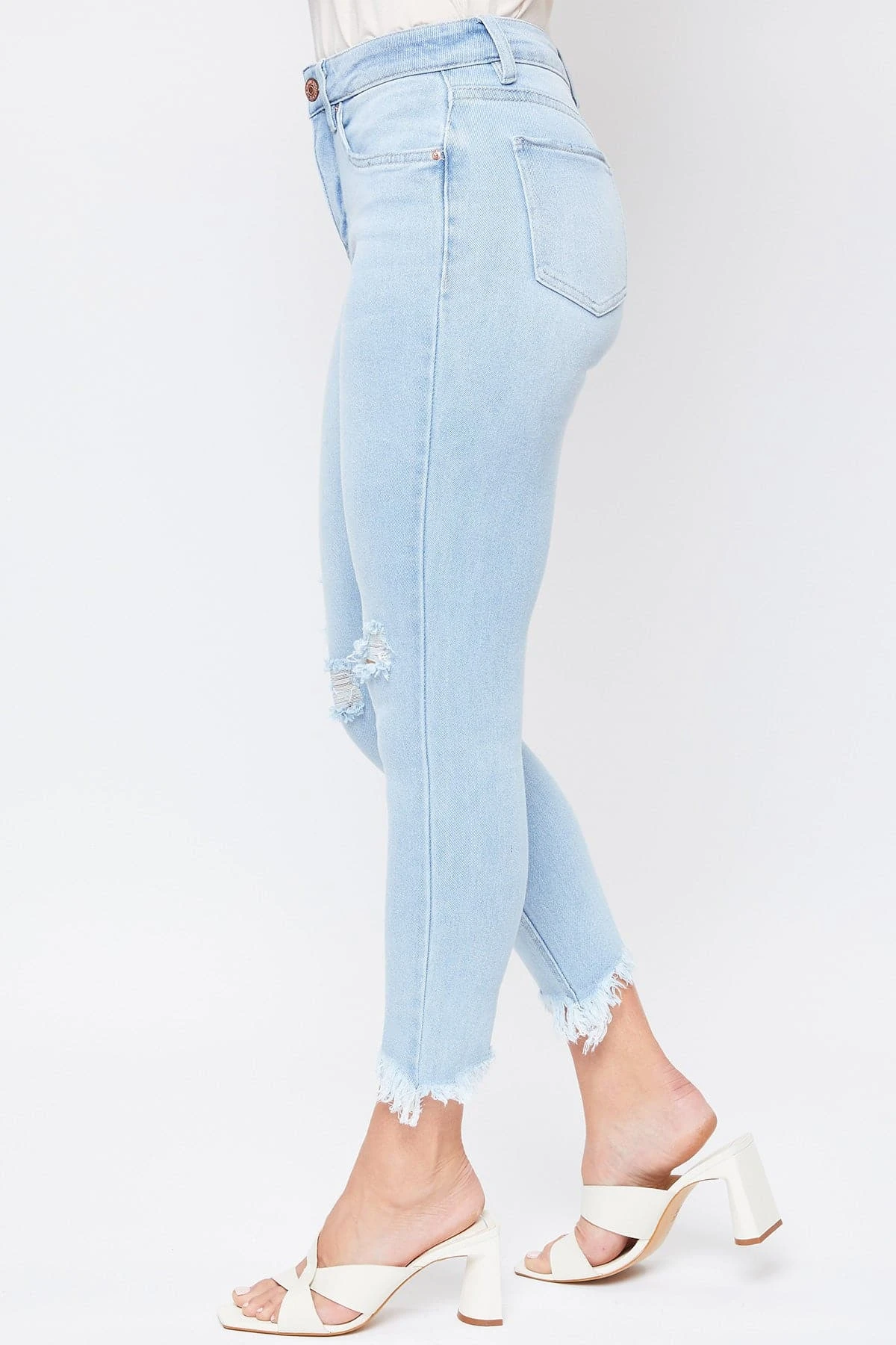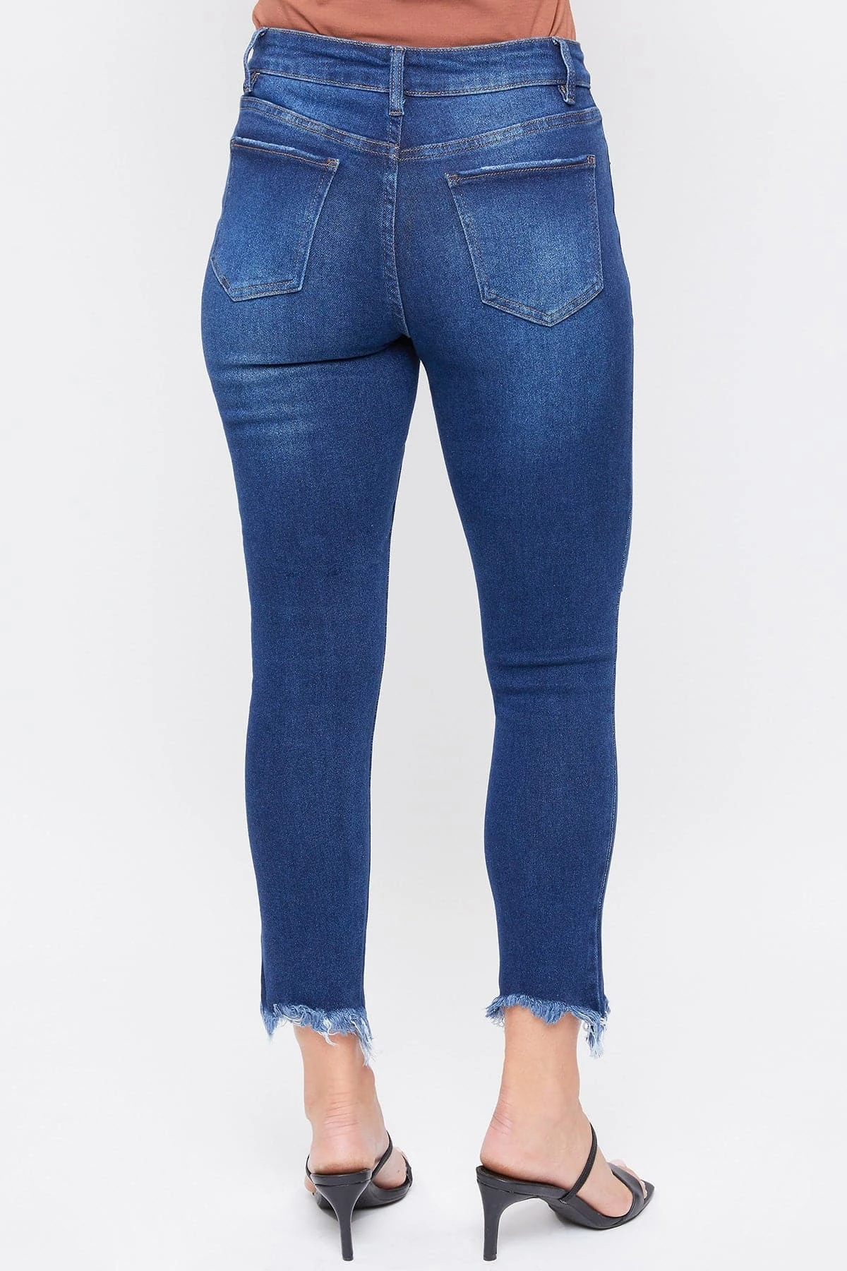 Our Missy Vintage High Rise Frayed Hem Ankle Jeans With Lyrca feature five-pocket construction, single-summary closure with front zip, frayed hem, light destruction, and belt loops. This garment contains LYCRA fiber for advanced stretch and is made of vintage denim. It moves with you throughout the day for a comfortable, flexible fit. Wear these jeans to your next barbeque or outdoor party.