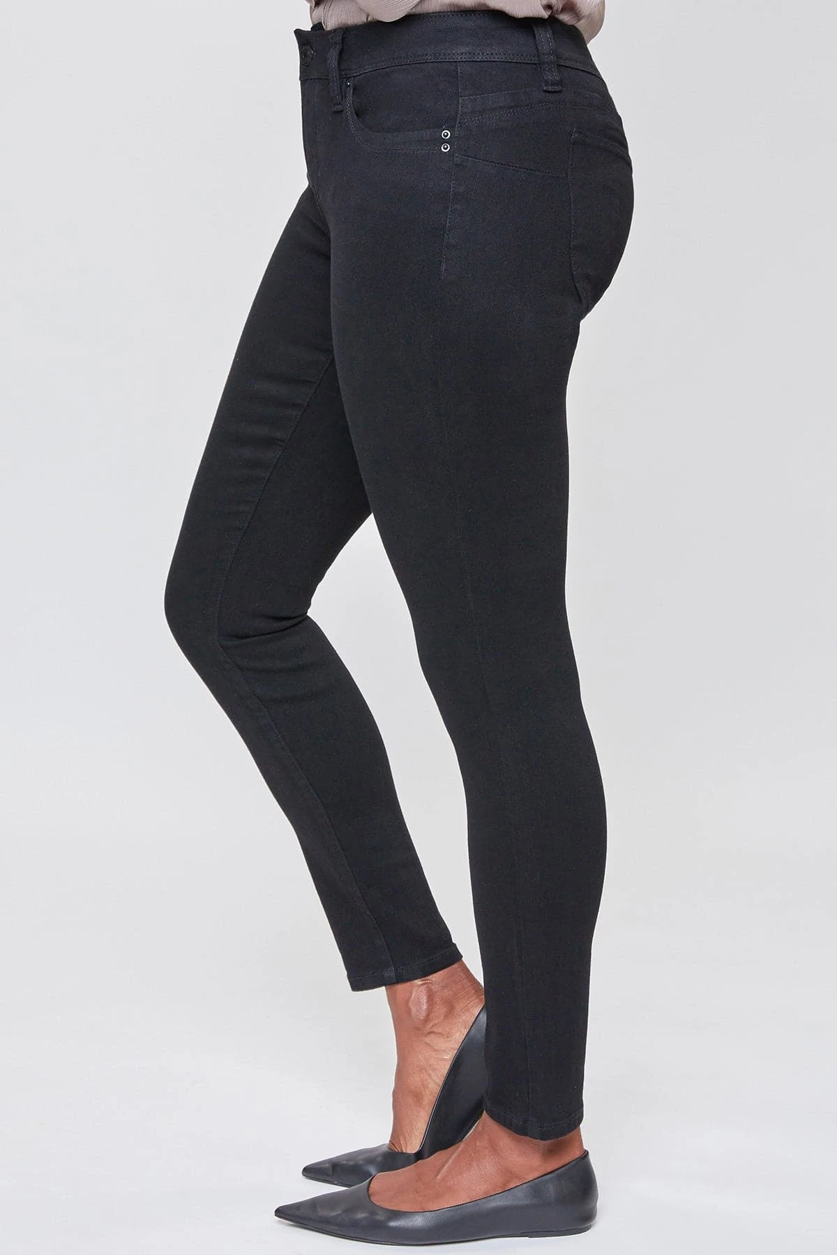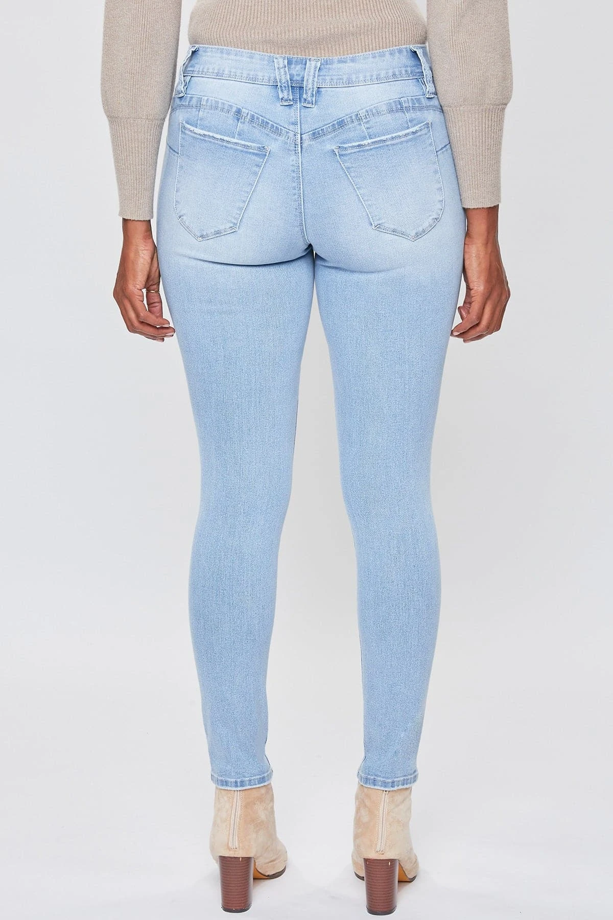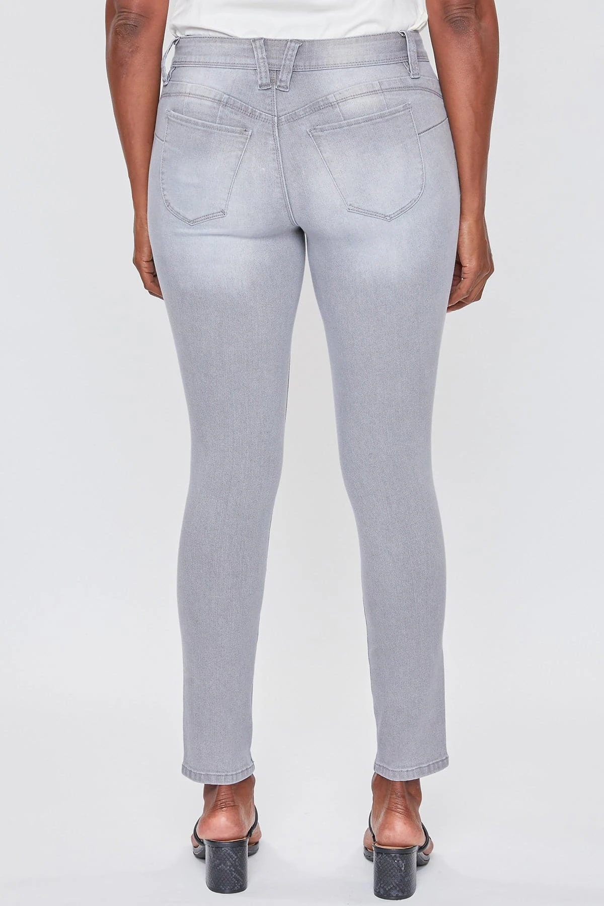 Our most popular skinny jean just got better! Our Women WannaBettaButt 1-Button Mid-Rise Regular Hem Skinny Jean Made with Recycled Fibers not only looks and feels good, but is good for the environment too! Designed with our signature WBB heart-shaped stitching and unique pocket shape to help enhance your curves and achieve a flattering, firmer look. Engineered with built-in panels and special construction at the waistline for perfect tummy control. Dress these up with heels and a blouse, or dress down with sneakers and a tee. With the versatility of these jeans, the styling options are endless!Â