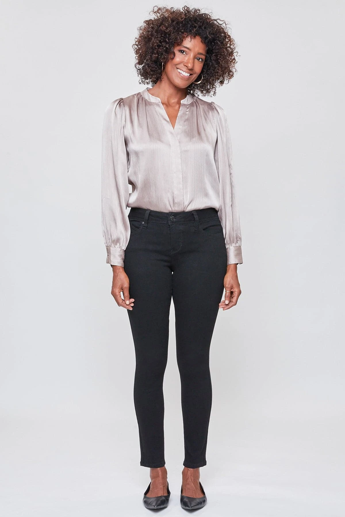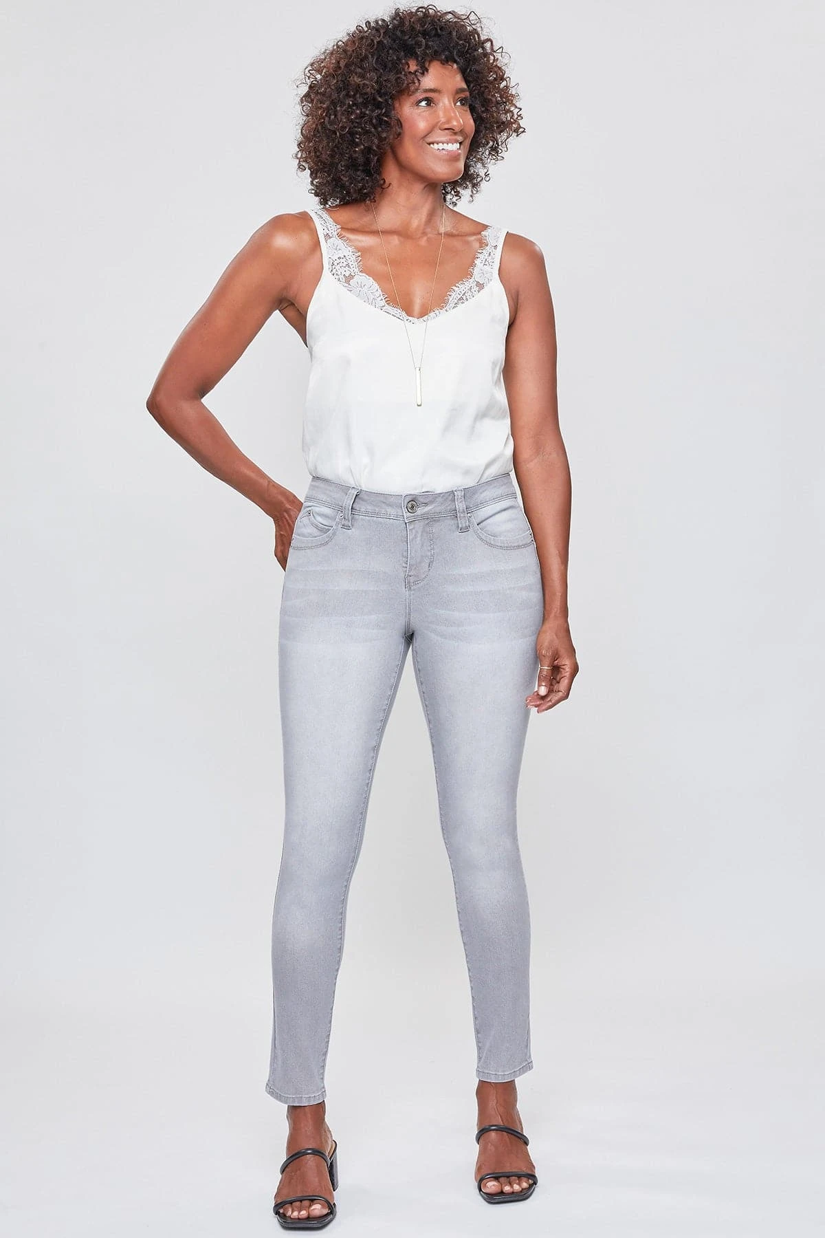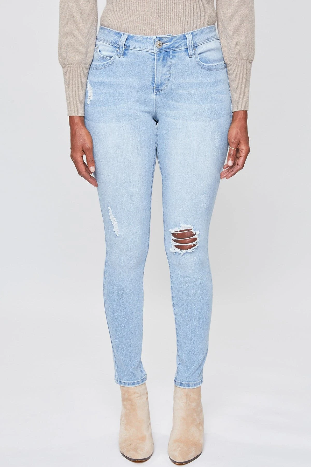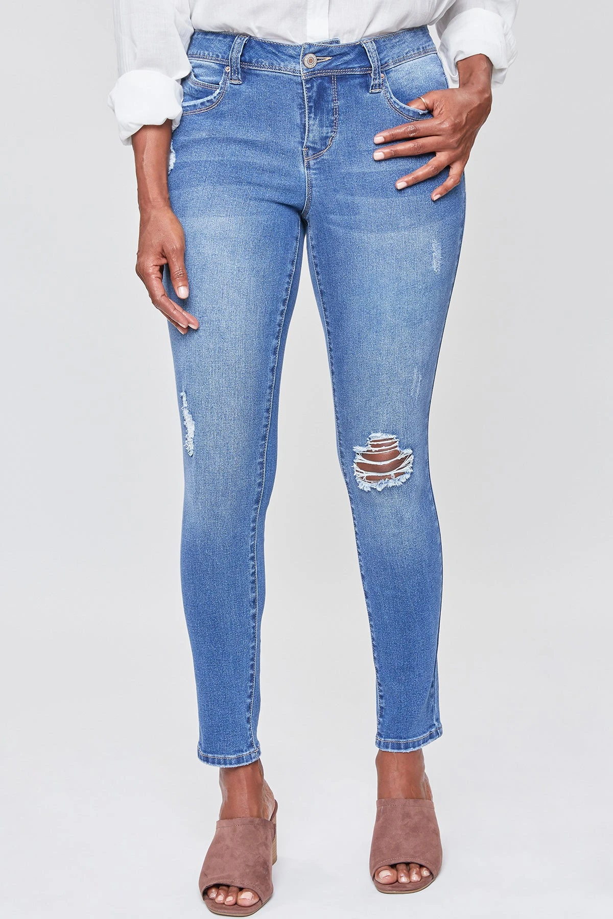 Our most popular skinny jean just got better! Our Women WannaBettaButt 1-Button Mid-Rise Regular Hem Skinny Jean Made with Recycled Fibers not only looks and feels good, but is good for the environment too! Designed with our signature WBB heart-shaped stitching and unique pocket shape to help enhance your curves and achieve a flattering, firmer look. Engineered with built-in panels and special construction at the waistline for perfect tummy control. Dress these up with heels and a blouse, or dress down with sneakers and a tee. With the versatility of these jeans, the styling options are endless!Â