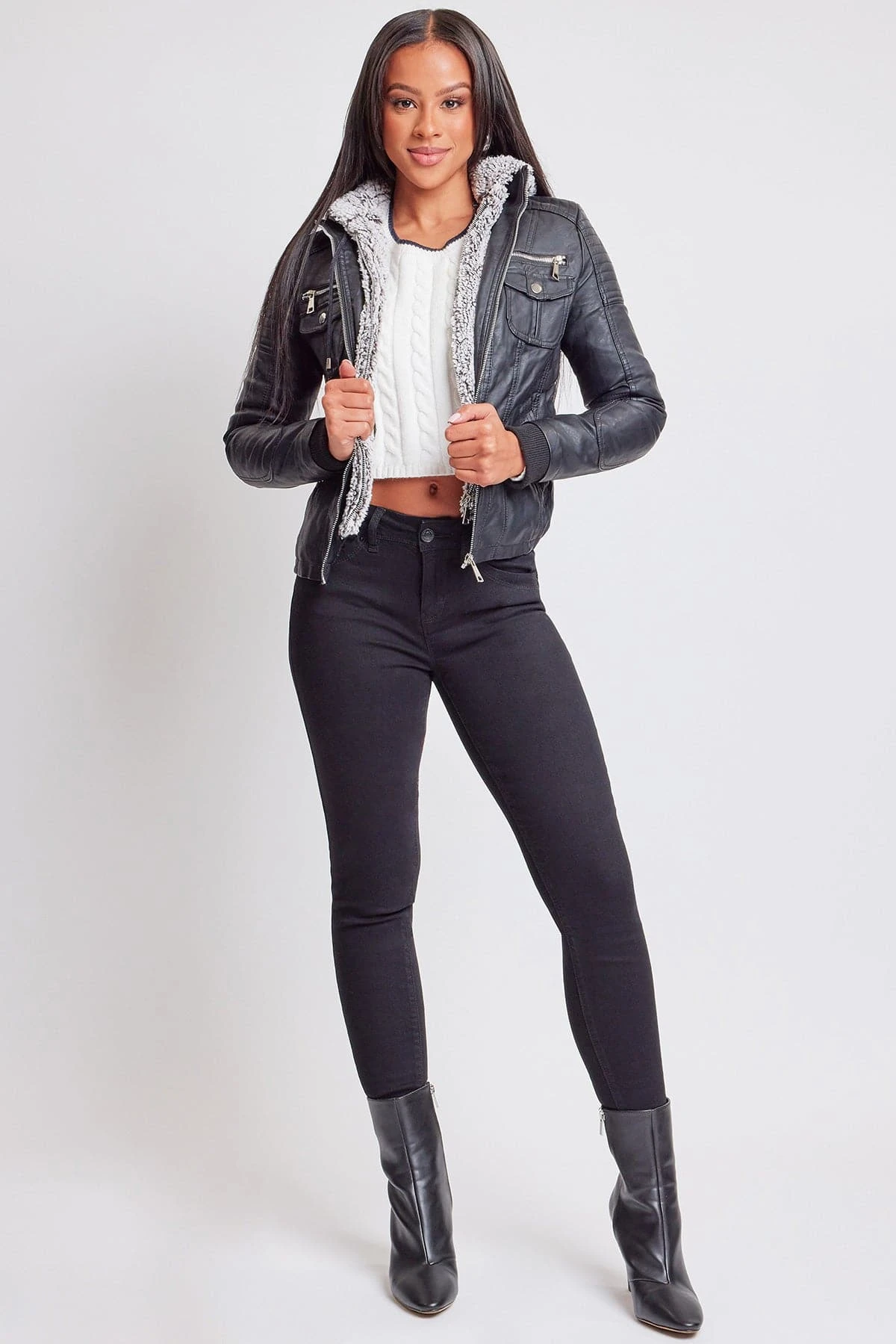Our Faux Leather Jacket with Sherpa Fur Hoodie gives you an edgy look with silver metal hardware, while providing you with warmth and comfort with a faux fur interior and built-in Sherpa hoodie. Featuring a front zip closure, zip front pockets, and snap summary pockets.
